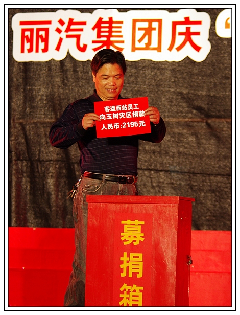 演唱會(huì)上,麗汽集團(tuán)員工為玉樹(shù)地震災(zāi)區(qū)進(jìn)行了捐款,所募集的21981元善款轉(zhuǎn)交市慈善總會(huì)。