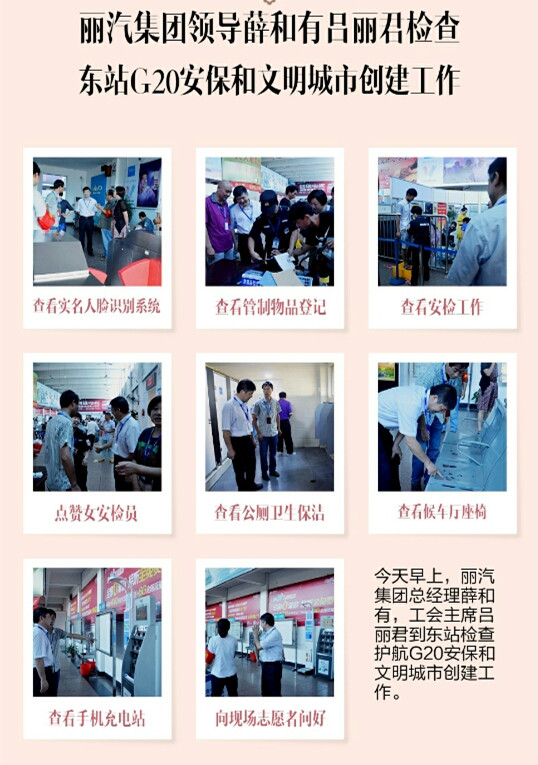 今天上午,麗汽集團(tuán)總經(jīng)理薛和有、工會主席呂麗君到東站檢查護(hù)航G20 安保和文明城市創(chuàng)建工作。
