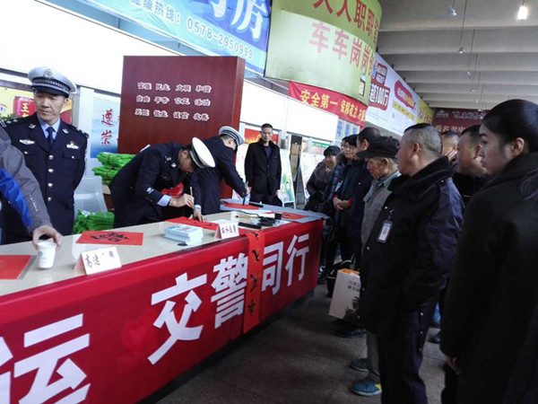 今天麗水市高速交警同志也給旅客帶來可驚喜,他們揮動(dòng)手中的毛筆為旅客寫下一幅幅承載著吉祥、平安的春聯(lián),旅客們拿著春聯(lián)露出幸福的笑容,為春運(yùn)添上了一抹光彩。