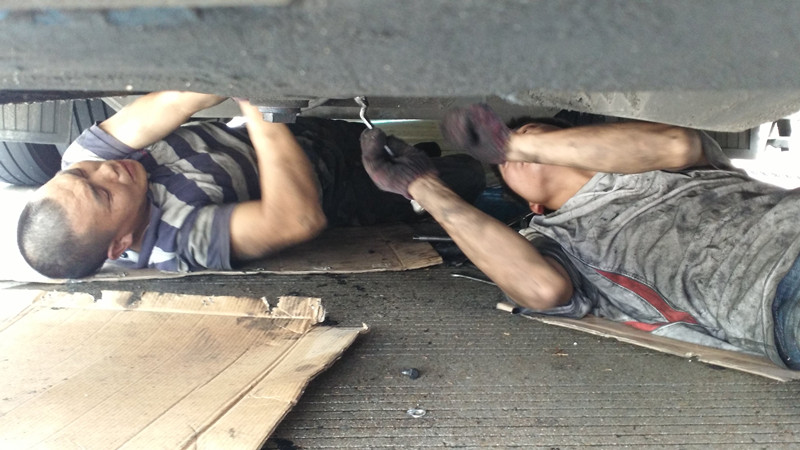 由于受臺風(fēng)影響,到達(dá)服務(wù)區(qū)時(shí)雖正值瓢潑大雨,但維修工陳永峰、李建波毫無怨言,立即投入到緊張的維修工作中去。由于受搶修場地的限制,他倆不能躺在木制躺板上進(jìn)入低底盤的車底,只能在流淌著雨水的地上鋪上一塊紙板,趴在車廂底下工作,不一會兒他倆的衣服就濕透了,非常辛苦。時(shí)而烈日當(dāng)空,時(shí)而滂沱大雨的臺風(fēng)天,兩位維修師傅的衣服也是濕了干、干了濕,經(jīng)過努力,終于排除故障,完成搶修任務(wù)。