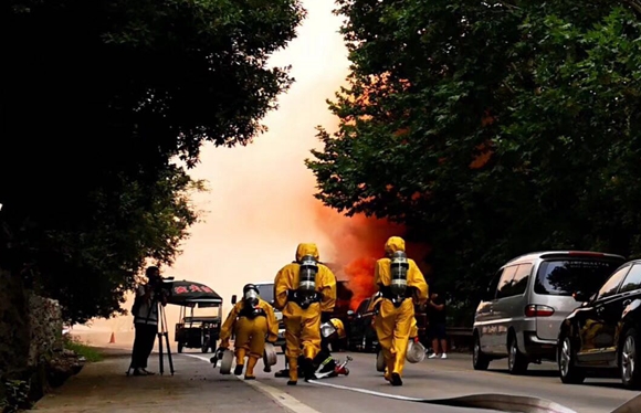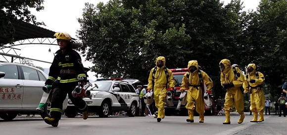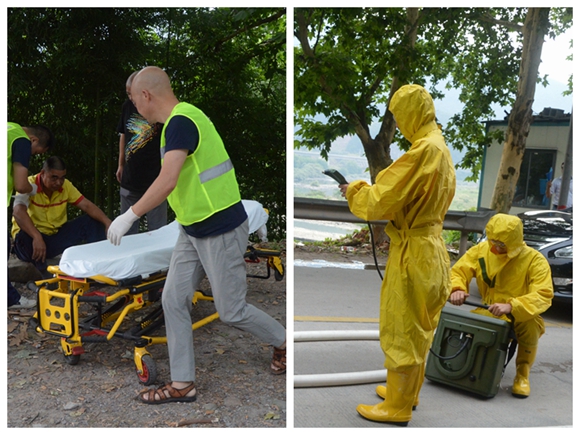 120趕到救治傷員、環(huán)保監(jiān)測人員進(jìn)行現(xiàn)場監(jiān)測