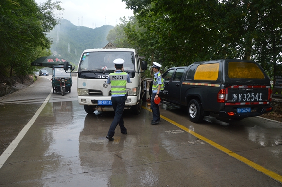 交警在危險地段拉起警戒線