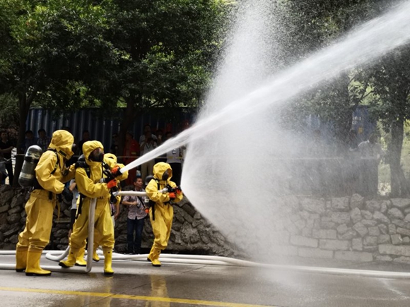 演練模擬一輛大客車在危險品運輸罐車事故路段受阻,面對危險品泄漏爆炸危險,道路運輸工作人員立即組織乘客撤離危險區(qū)域,及時上報險情并采取安全處置措施,等待交警、消防員、醫(yī)護(hù)和環(huán)保測評等人員趕赴現(xiàn)場處理的過程。短短10多分鐘,20個場景的演練科目流程一氣呵成。演練場景驚險逼真,扣人心弦,贏得了在場觀演人員和群眾的一致好評。