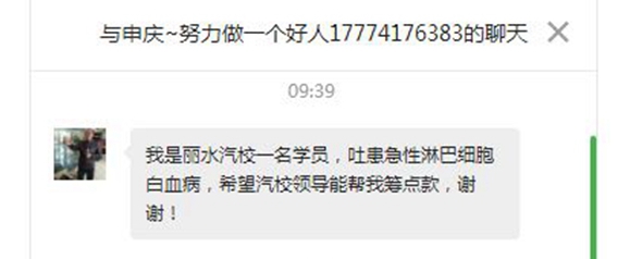 6月27日,麗汽集團(tuán)汽車技術(shù)學(xué)校的微信公眾號收到一條來自學(xué)員的消息:“我是麗汽汽校的一名學(xué)員,突患急性淋巴細(xì)胞白血病,希望汽校領(lǐng)導(dǎo)能幫我籌點款,謝謝!”