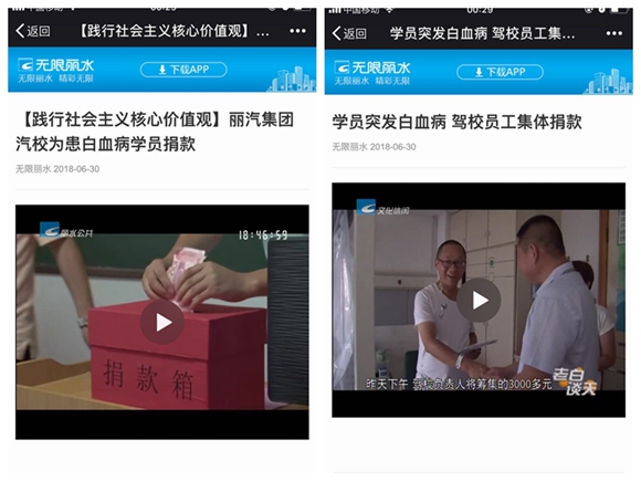 得知麗汽集團(tuán)汽校這樣一家培訓(xùn)機(jī)構(gòu),能自發(fā)為身患重病的外地學(xué)員組織愛心捐款后,麗水公共頻道新聞和文化休閑頻道老白談天欄目專門就這一事件進(jìn)行了專題報道,稱贊這是一個踐行社會主義核心價值觀的愛心故事。