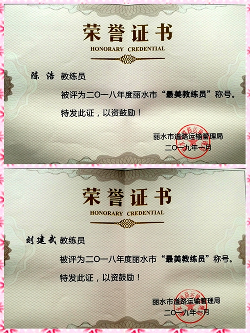 近日,麗水市道路運輸管理局印發(fā)了《關(guān)于表彰2018年度“文明示范駕培學?!奔啊白蠲澜叹殹钡耐▓蟆罚惼T谠u選活動中脫穎而出,順利通過評審組復(fù)評,再次榮獲年度市級“文明示范駕培學校”榮譽稱號,這也是我校連續(xù)六年榮獲此項殊榮。同時,麗汽汽校的陳浩、劉建武兩位同志獲得2018年度麗水市“最美教練員”稱號。