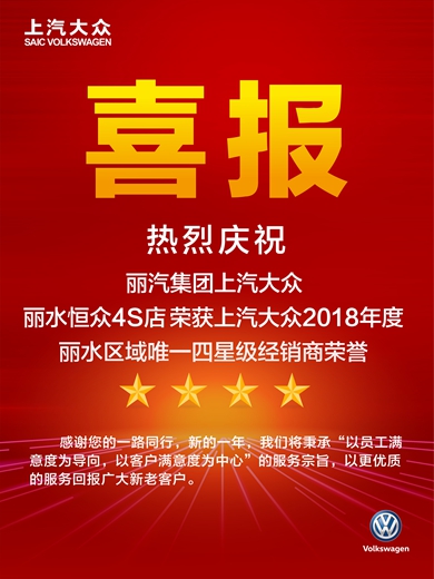 麗水恒眾公司在全國一千多家經(jīng)銷商中脫穎而出,喜獲“上汽大眾四星級經(jīng)銷商”榮譽稱號 。麗水恒眾公司開業(yè)首年就能取得如此成績實屬不易,2018年公司在全體員工的共同努力下,新車銷售量、售后服務(wù)臺次、客戶滿意度、DCDA檢查、售后AuditⅡ檢查均達(dá)到廠家要求的四星標(biāo)準(zhǔn)。這是對恒眾全體員工2018年各項工作的肯定和勤懇工作的回報。