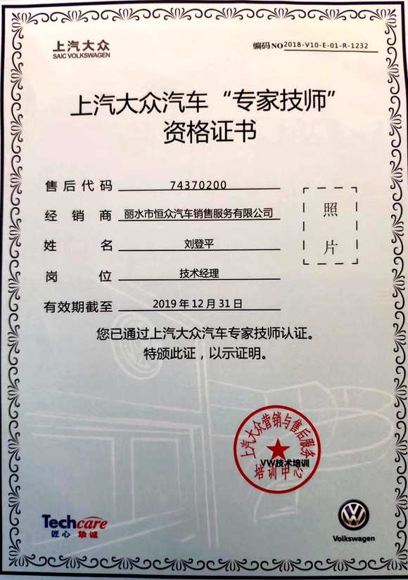 近日,麗水恒眾公司技術(shù)經(jīng)理劉登平被評(píng)為上汽大眾“專家技師”。這是上汽大眾品牌進(jìn)駐麗水市區(qū)以來(lái)員工首次獲得該項(xiàng)榮譽(yù)。劉登平是上汽大眾在麗水市目前唯一一個(gè)獲此榮譽(yù)的專家技師。