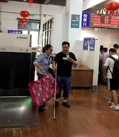 “我們就是您的眼睛啊,有我們?cè)?,您就安心吧!?br/> 11月4日下午,麗水高鐵站公路客運(yùn)上客點(diǎn)里,檢票的空檔,隔著窗戶(hù),聽(tīng)到如此暖心的一句話(huà),我不禁抬頭尋聲望去。看到我們的導(dǎo)乘員劉遠(yuǎn)玲扶著一位男士,往候車(chē)室慢慢走進(jìn)來(lái)。仔細(xì)一看,是一位盲人旅客。劉遠(yuǎn)玲把旅客帶到了離檢票口最近的位置坐下,對(duì)旅客說(shuō):“先生,您坐在這里稍等下,售票窗口人多,怕擠著您,13點(diǎn)09的松陽(yáng)車(chē)馬上就到了,把證件交給我,我?guī)湍哑辟I(mǎi)好。”又轉(zhuǎn)身對(duì)我交代了下:“等下檢票的時(shí)候怕是人會(huì)多,你注意下,別讓旁邊的人撞著這位同志?!?br/> 盲人旅客聽(tīng)著劉遠(yuǎn)玲走開(kāi)的聲音,很激動(dòng)的對(duì)我說(shuō):“你們站的工作人員真好,從我一進(jìn)車(chē)站就過(guò)來(lái)扶著了。現(xiàn)在又幫忙買(mǎi)票。真好,真好……”話(huà)剛落,劉遠(yuǎn)玲買(mǎi)好票遞了過(guò)來(lái),“13:06分了,你先幫他把票檢了,我現(xiàn)在扶他出去等車(chē),這樣時(shí)間剛剛好?!?br/> 只見(jiàn)劉遠(yuǎn)玲扶著盲人旅客慢慢走出候車(chē)室,等待車(chē)子進(jìn)站停穩(wěn),又跟駕駛員師傅一起把盲人旅客扶上了車(chē),安排在了最靠近下車(chē)門(mén)的位置,系好安全帶,交代了幾句,才放心的走下車(chē)來(lái)。我打趣到:“美女,累不累?”劉遠(yuǎn)玲笑著說(shuō):“我怎么會(huì)累,是他們這些特殊的旅客,出門(mén)不方便,真的會(huì)很累,我們能多幫到一位,就多一份安心!”