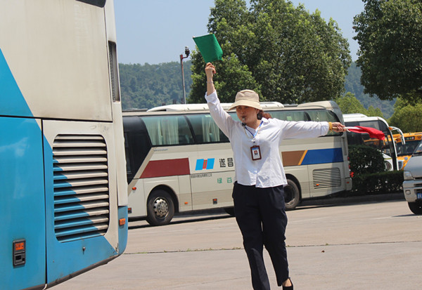 8月3日上午10:30分,地表溫度已經(jīng)接近50攝氏度,走在室外,隔著鞋底就能感受到地面上滾燙的溫度,行車(chē)員洪麗頭頂烈日,認(rèn)真地為車(chē)輛引航,吹哨、倒走、揮動(dòng)紅綠旗、小跑……一套動(dòng)作下來(lái),豆大的汗水從額頭滴下來(lái)。