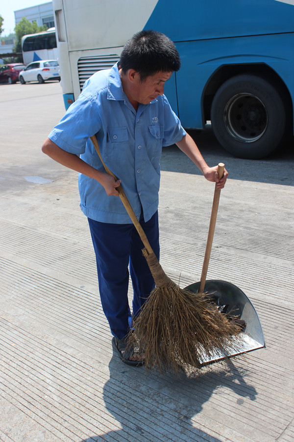 “中午時(shí)間這么熱,受得了嗎?” 他笑笑回答道:“熱是熱,既然來(lái)上班,工作總是要認(rèn)真的做好?!?站場(chǎng)發(fā)車(chē)區(qū)以及通道衛(wèi)生都是宓建文今天當(dāng)班的清掃范圍,他頂著烈日掃上一圈至少要半個(gè)小時(shí),每次掃完在下客區(qū)稍坐片刻,喝上一口水,又提著簸箕和掃把開(kāi)始新一輪的清掃。他說(shuō):“要是時(shí)間間隔再長(zhǎng)些,垃圾就會(huì)多,特別是發(fā)車(chē)區(qū)前是旅客檢票上車(chē)的必經(jīng)之路,不清掃勤些,有損車(chē)站整潔衛(wèi)生的形象?!?br/> 11:30時(shí),火紅的太陽(yáng)炙烤大地,加之客車(chē)散發(fā)的熱浪撲面而來(lái),行包裝卸工冒著熱浪辛勤作業(yè),準(zhǔn)時(shí)地收發(fā)一批批貨物;門(mén)檢人員頭頂烈日,認(rèn)真的對(duì)每一輛出站客車(chē)按規(guī)定進(jìn)行安全檢查;保衛(wèi)稽查人員頭頂著驕陽(yáng)執(zhí)勤,保障了旅客候車(chē)環(huán)境安全有序……分散在不同崗位的一線客運(yùn)職工揮汗如雨,他們都在為更好的服務(wù)旅客而辛勤勞動(dòng)著。