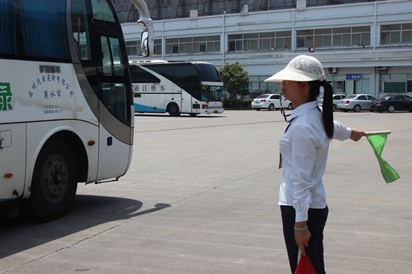 正午時(shí)分,行車員們頂著烈日,揮動(dòng)著紅綠旗,認(rèn)真地為車輛引航,安全及時(shí)地送出一撥撥旅客。愛美之心人皆有之,行車組的姐妹們也不例外,可是為了發(fā)車安全,一件長(zhǎng)袖襯衫、一頂遮陽帽就是她們面對(duì)毒辣太陽的全副武裝。