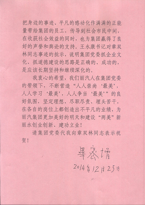 麗汽集團(tuán)離休干部畢密增發(fā)來賀信肯定麗汽精神文明建設(shè)