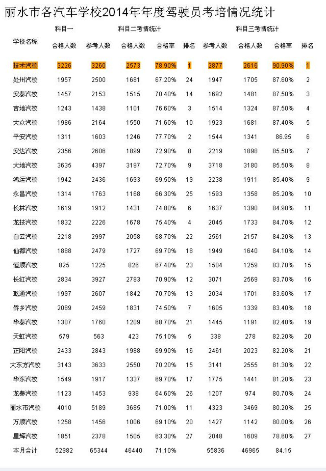 另據(jù)“麗水市各汽車學校2014年年度駕駛員考培情況統(tǒng)計”數(shù)據(jù)顯示,麗汽集團汽校2014年年度駕駛員考培科目二、科目三的考試合格率分別達到78.90%和90.90%,兩項排名均居全市第一。