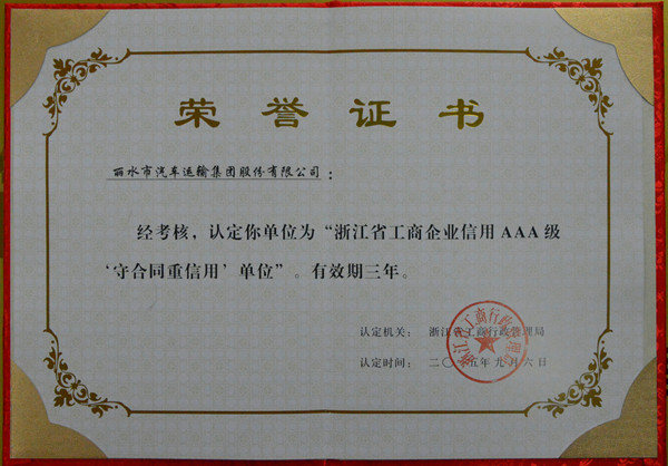 日前,麗汽集團(tuán)被認(rèn)定為浙江省工商企業(yè)信用3A級(jí)“守合同重信用”單位,有效期三年。11月13日上午,麗水市市場(chǎng)監(jiān)管局直屬分局監(jiān)管科科長(zhǎng)吳乾水專程為公司送來(lái)“浙江省工商企業(yè)信用AAA級(jí)守合同重信用單位”的匾牌及榮譽(yù)證書,并對(duì)麗汽集團(tuán)守合同重信用工作表示了充分的肯定。