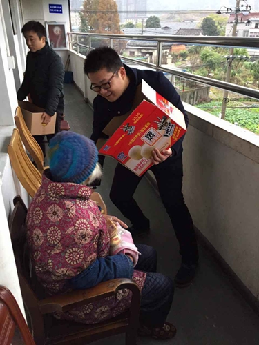 經(jīng)過20多分鐘的車程,我們到達了靈山敬老院,那里很安靜祥和,大家都激動不已。因為事先聯(lián)系過,一下車,就有許多老人在門口等候我們了。看著我們帶來的一箱箱的水果和好幾袋的餅干蛋糕時,身旁的老人就一直沖著我們說:“你們太好了,還買這么多東西給我們,真是當(dāng)不起的”。我們十余名團員迅速分工,有的將水果和餅干分箱裝袋,有的負責(zé)派送三樓的老人,有的負責(zé)派送二樓的老人,經(jīng)過一個多小時的努力,我們終于全部派送完全部的物品。
