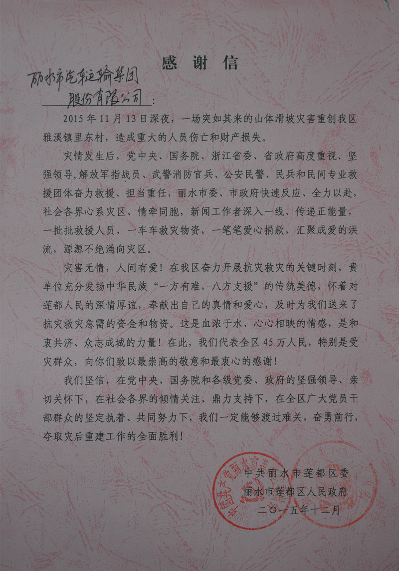 12月14日,集團(tuán)公司收到蓮都區(qū)委區(qū)政府送來(lái)的感謝信,感謝集團(tuán)公司在里東災(zāi)區(qū)救援工作中的奉獻(xiàn)。